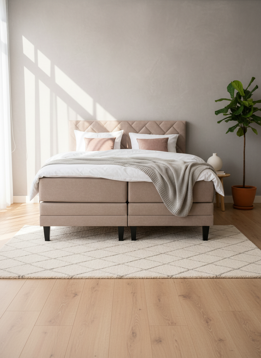 Luxe boxspring bed in beige suède-look. Gecapitonneerd hoofdbord met ruitpatroon. Van Landschoot, tweepersoons.