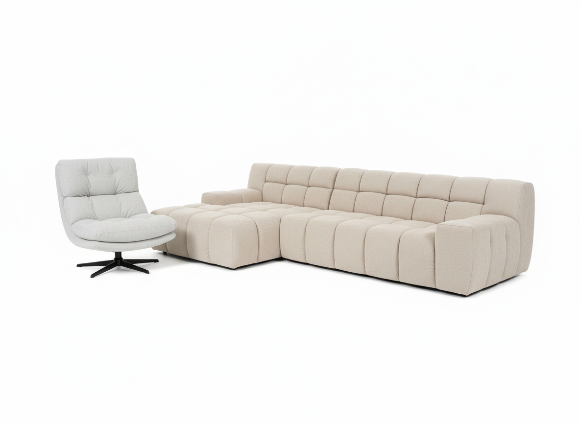 Luxe hoekbank volledig gecapitonneerd in crème/beige. Inclusief bijpassende draaifauteuil.