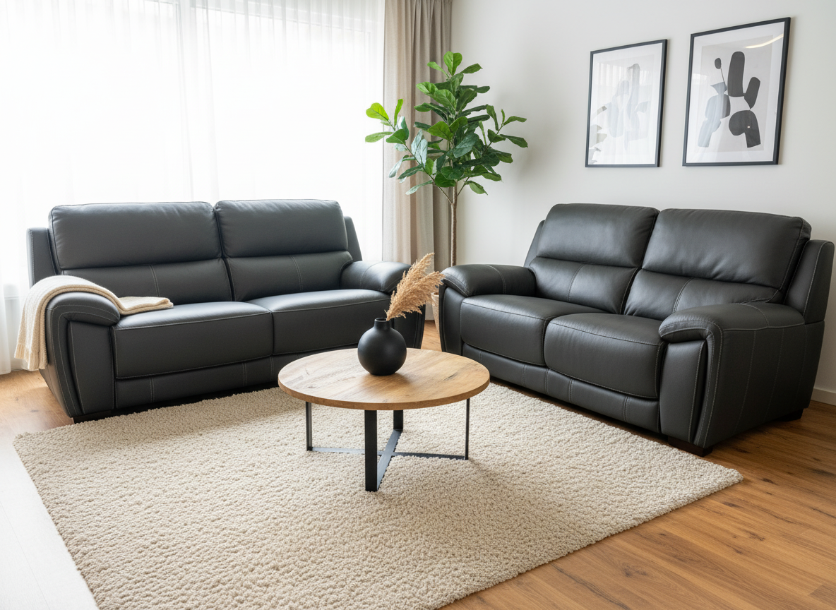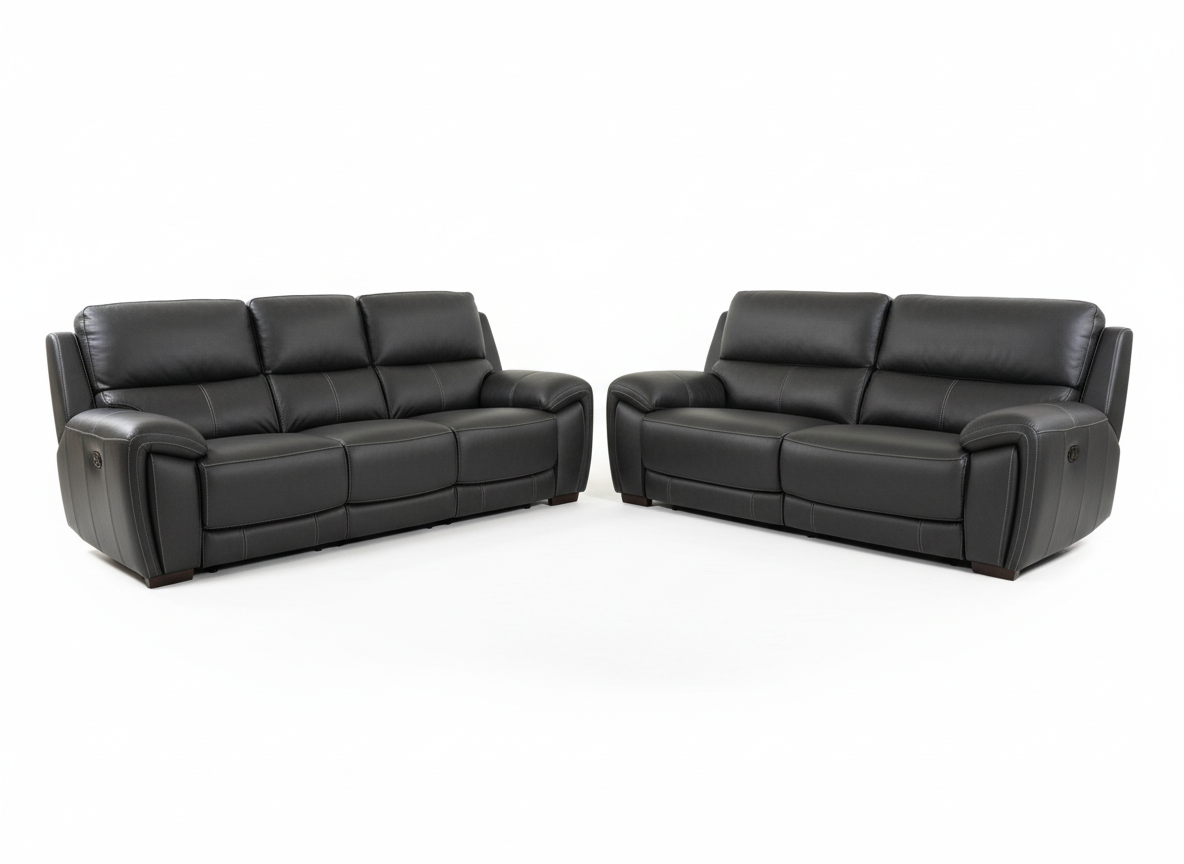 Bankstel 3+2 in donkergrijs leer. Relaxfunctie.