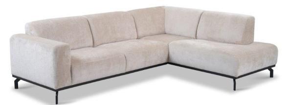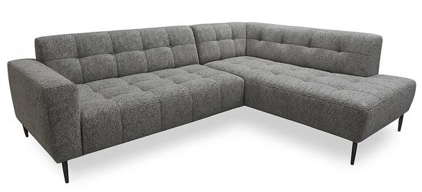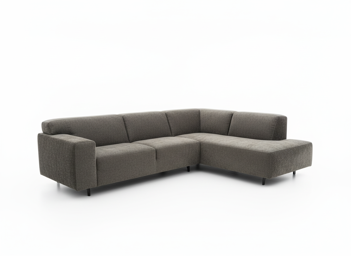 Moderne hoekbank met chaise longue in donkergrijs chenille. Brede armleuningen, lage poten.