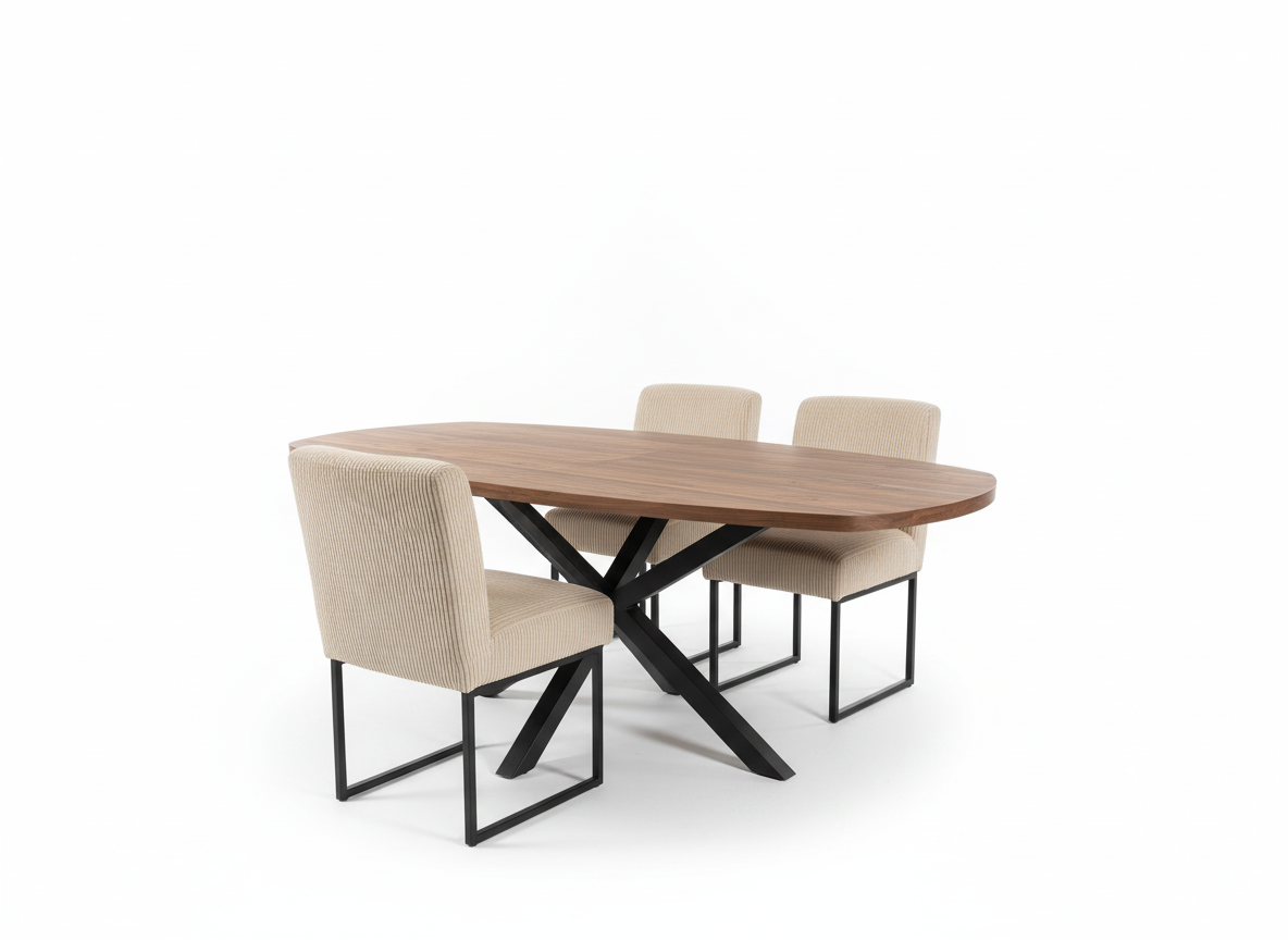 Ovale eettafel in walnoot fineer met X-poot onderstel. Geleverd met crème ribcord eetkamerstoelen.