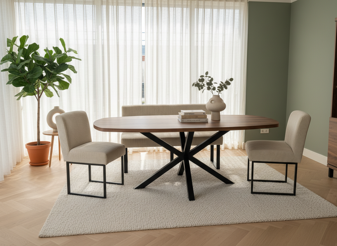 Ovale eettafel in warm walnoot fineer met stijlvol X-poot metalen onderstel. Inclusief crème ribcord eetkamerstoelen met stalen sledeframe. Complete tafelset voor een modern interieur. | Fotoprijs: €220 (stoel) | Wilt u meer informatie of een offerte? Neem gerust contact met ons op.