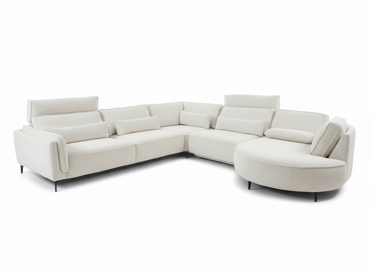 Grote luxe hoekbank in wit/crème geweven stof met afgeronde ottomane. Losse rugkussens.
